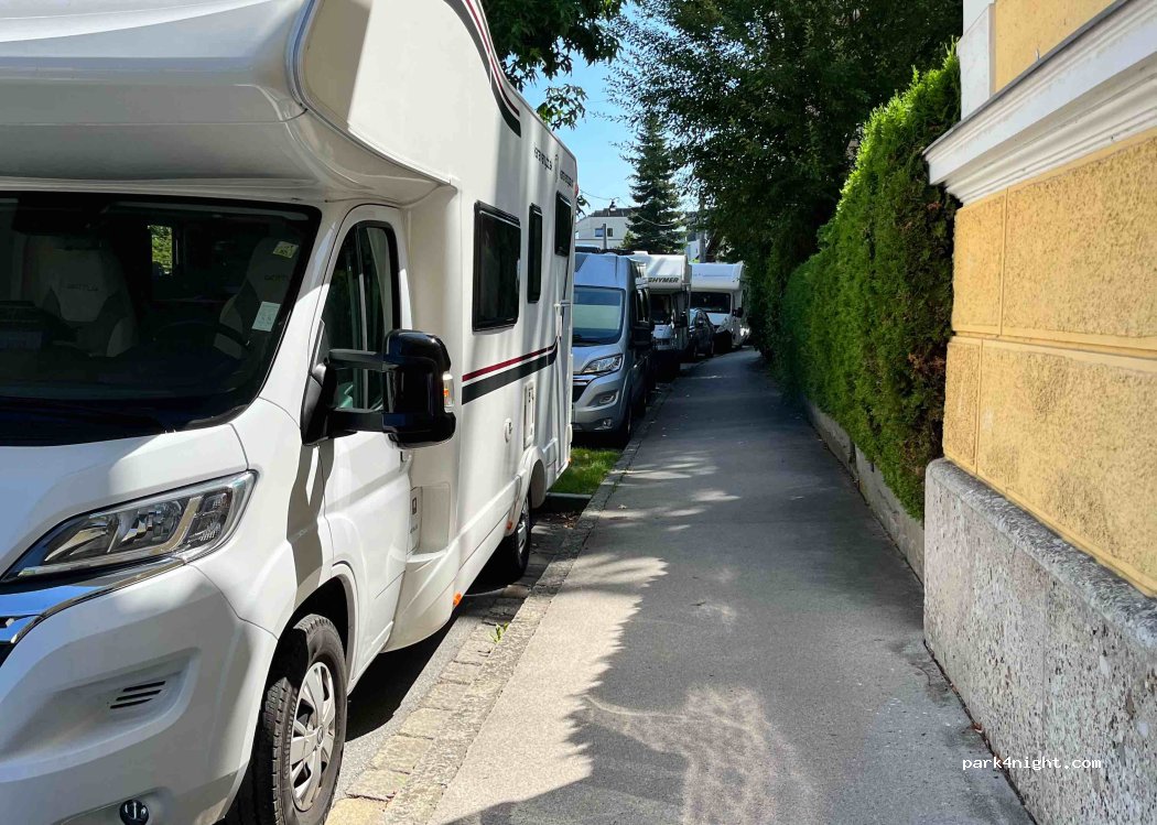 Parkplätze an der Seite der Strasse. Tolle Möglichkeit um Salzburg zu erkunden (15min zu Fuss) & am Sonntag sogar kostenlos. Wir hatten mit unserem 6m Van gut einen Platz gefunden, aber das lag vermutlich am regnerischen Sonntag.
