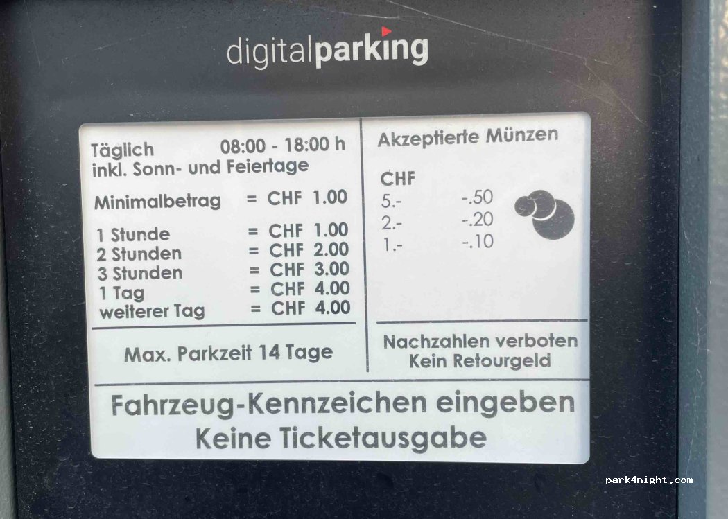 Parken kostet von 08-18 Uhr. Ab 4 Stunden bis den ganzen Tag 4 CHF. Keine Verbotsschilder für übernachten