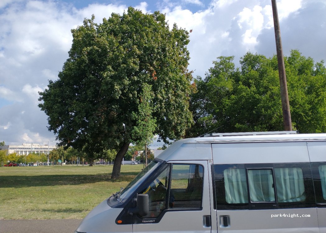 Nice place to park for the day, possible to park for a night. 10/15 minutes walk to city centre. Free parking, next to a park to walk around with a dog. Close to a main road but seems quiet