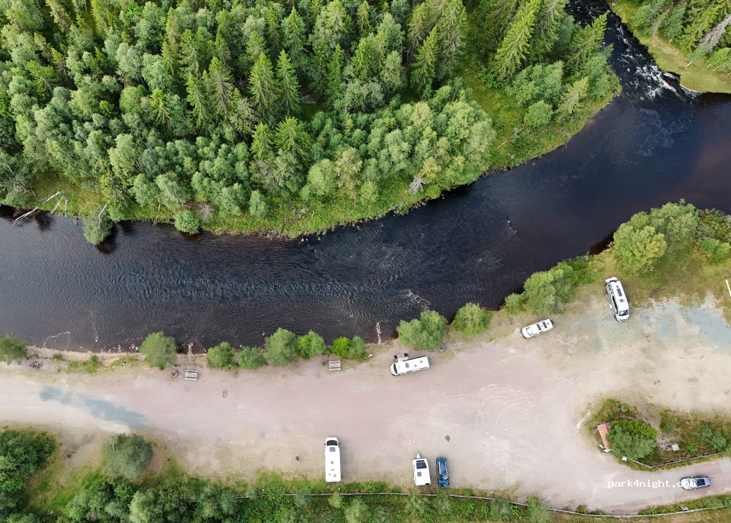 zeer mooie plaats om te overnachten, langs het water en kort bij natuurgebied. maar, te weinig faciliteiten voor de prijs: totaal 180 SEK voor de plaats met electriciteit en 2 droogtoiletten in totaal. géén mogelijk om vers water te nemen of om grijs of zwart water te lozen . wel fijne uitvalsbasis naar de waterval