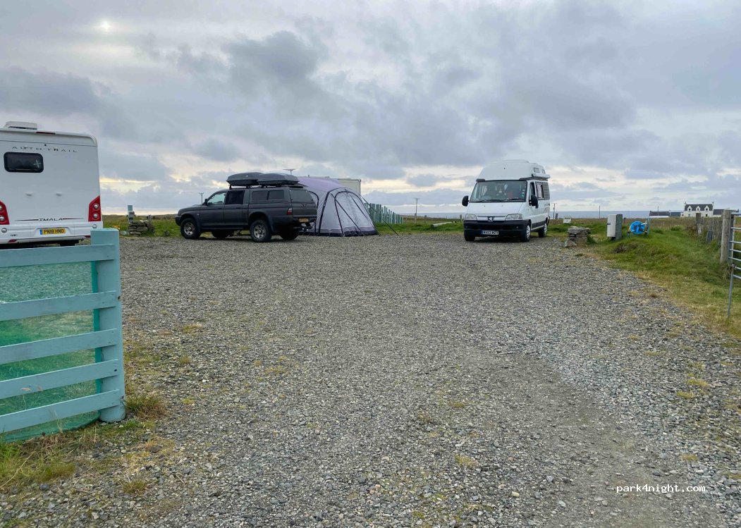 This is a real gem of a place to stay, small with only electric hookup & water. All other facilities available in the village 5 minutes away. Lot of places to walk, local bits to visit, beaches very close by. View over fields to the sea. Lots of birds & wildlife in the area. Donna & her dad, really nice people manage the croft. Well worth the small cost to stay here. 7mtr motorhomes fit easily.