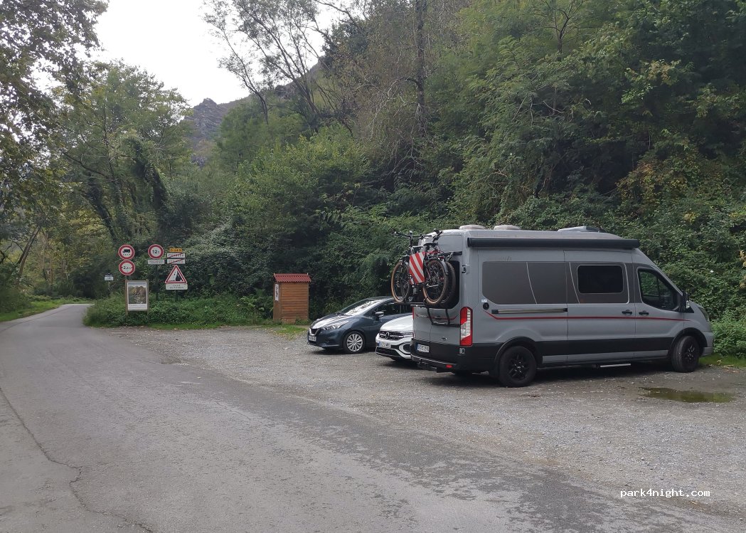 Endroit calme et sympa pour une nuit, peu de passage à cette période de l'année. Rivière en contrebas et départs de rando. On ne peut pas aller plus loin car il y a de nouveaux panneaux d'interdiction pour emprunter la route du col : véhicules de plus de 2,2m de large et 5m de long interdits. Et au vu de la route ça se comprend ! Très étroite avec parois rocheuses et impossibilité de se croiser.
