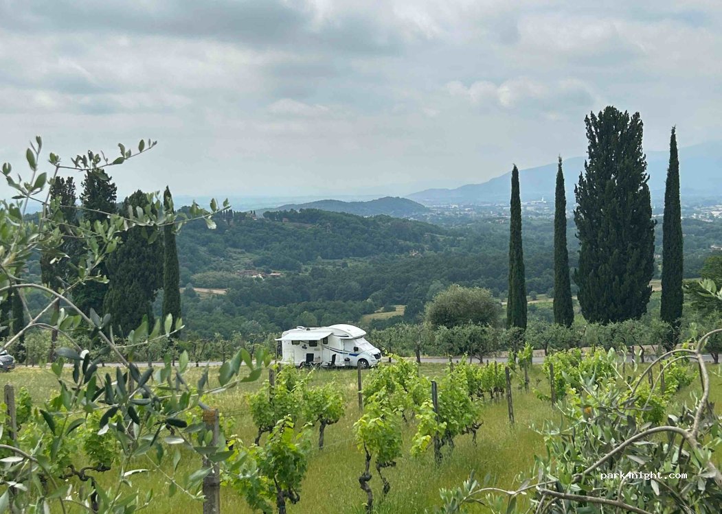 Spot extra dans la campagne Toscane. Le propriétaire qui nous a accueilli parle très bien anglais.Il faut réserver avant d'arriver car il n'y a que 4 places. nous n'avions pas le numéro, nous sommes donc passés à 16h avant d'aller visiter Lucca et pas de problème!c'est gratuit, nous avons donc pris du vin de leur production. merci pour cet endroit magnifique. A noter le manque d'ombre le matin.