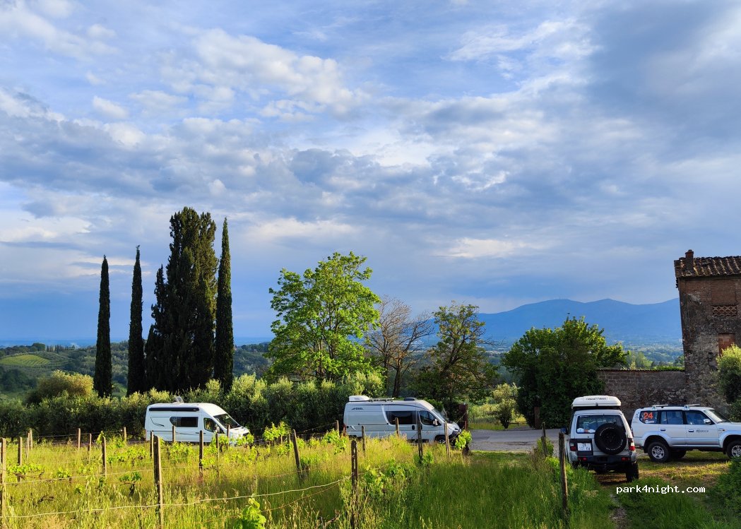 Stunning park up spot with a beautiful view of the Tuscan countryside. Extremely friendly and kind owner who gave us a tour of his vineyard and winery and even a chance to try and buy some of the delicious wine. Easy to find with the coordinates provided. Would 100% recommend
