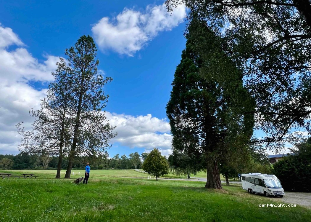 Sehr schöner Parkplatz für eine Nacht neben ein paar tollen Bäumen und einer kleinen Anhöhe mit Tischen Bänken. Nachts ist es sehr ruhig, und tagsüber ist eine mäßig befahrene Straße unmittelbar am Platz. Von hier aus kann man direkt eine kleine Wanderung mit dem Hund starten oder auch eine größere Fahrradtour in die Umgebung machen.