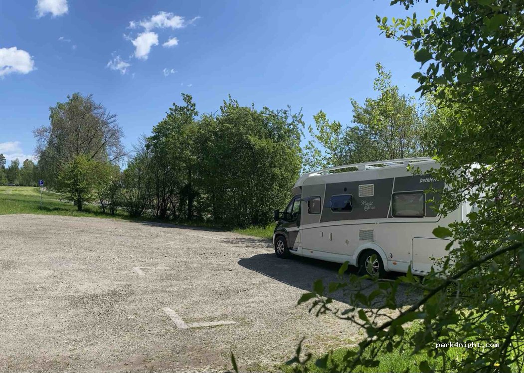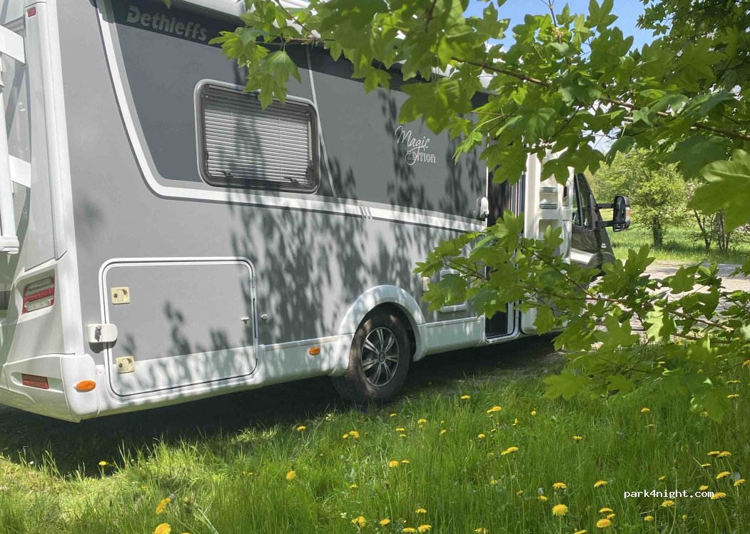 Two public parking spaces for motorhomes. However, there is also room for more. Is right on the street which is hardly used at night. There is also seating and a fire pit