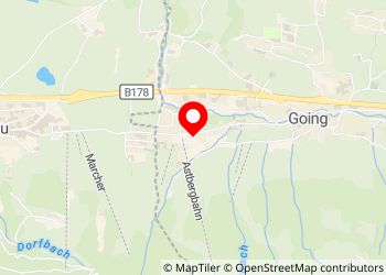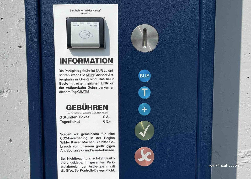 Camping verboten. Parkplatz neben der Sesselbahn, die zu einem See hinaufführt, 5 Gehminuten vom Stadtzentrum Going am Wilden Kaiser oder 15 Gehminuten von Ellmau, Parkplatz am Hang, der untere Teil ist flacher