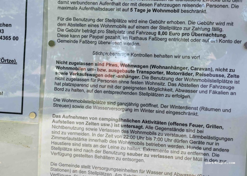 Wir haben eine ruhige Nacht dort gehabt. Aber bei 10,50 € (8 € 2,50€ Kulturtaxe) für eine Nacht stehen fühlt man sich abgezockt. Der Betrag soll überwiesen, im Rathaus bar oder direkt per PayPal bezahlt werden.
