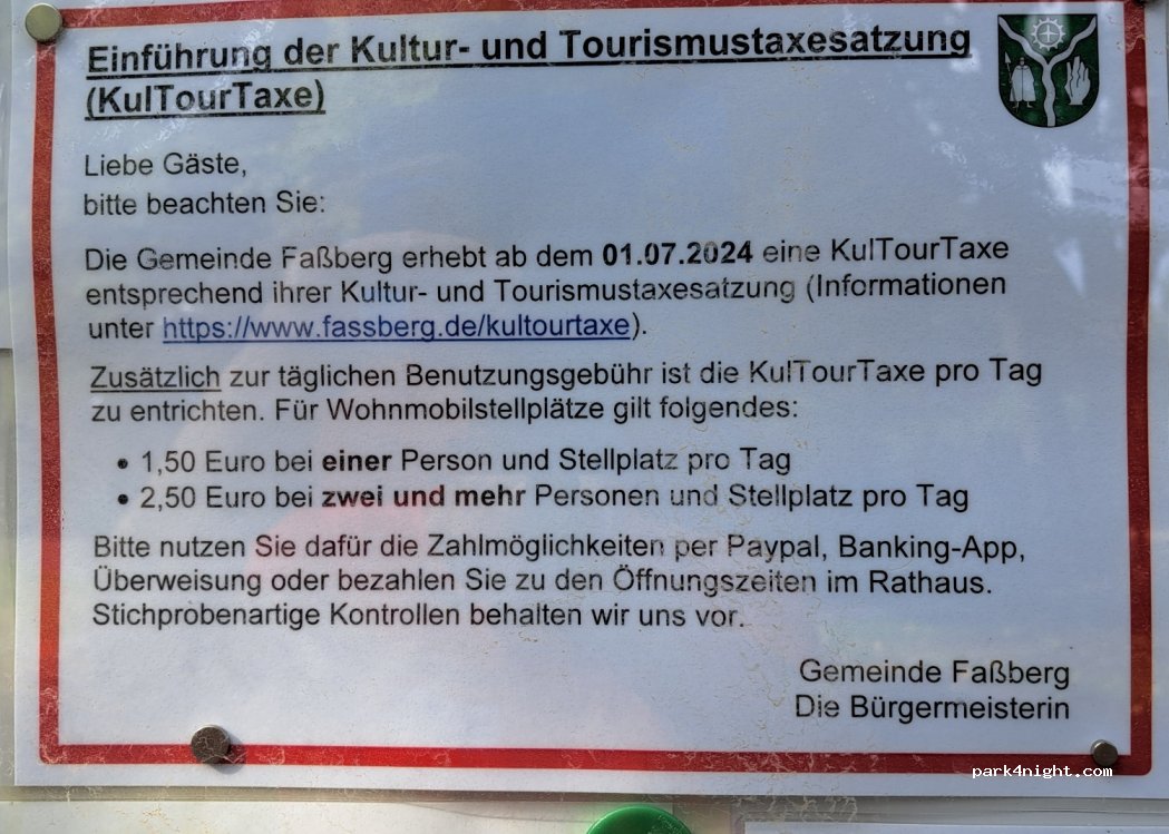Achtung! Ab dem 01.07.2024 ist außer der Standplatzgebühr von 8 € zusätzlich eine "Kultur- und Tourismustaxe" zu entrichten, und zwar bei 1 Person und Stellplatz 1,50 € und bei 2 oder mehr Personen und Stellplatz 2,50 € pro Tag. Dafür, dass es hier keine Dienstleistungen gibt, erscheint mir der Betrag von 10,50 € recht hoch.