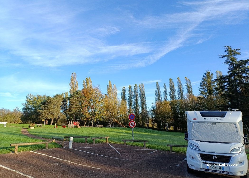 Parking tranquille loin de la route principale si vous vous garé au fond. Les places sont un peu penchées. Immense aire de jeu. Nous y sommes arrivés un dimanche soir alors que le parking est normalement accessible que hors week-end.
