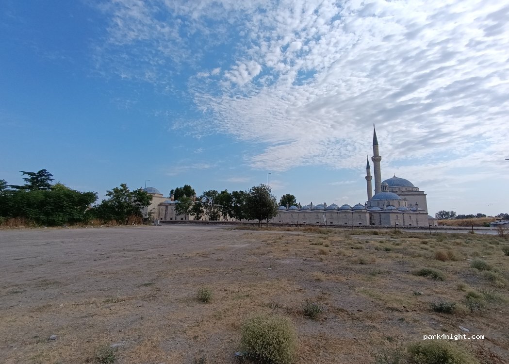 j'y suis, juste à côté de la mosquée Bayezid Kulliyesi, monument UNESCO du XIVeme siècle. Parking en gravier, WC et eau à la mosquée, à 1,5 km du centre. Très tranquille la nuit,peu de passage en journée.