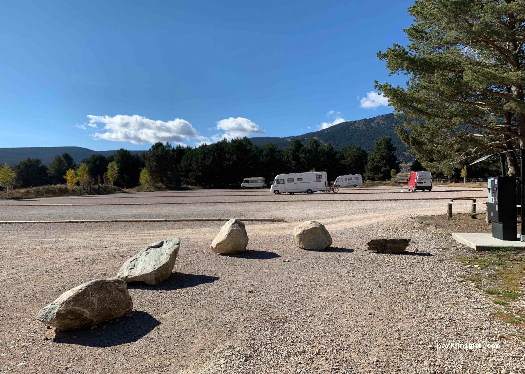 Gran parking de gravilla i places anivellades. Parking sense serveis, només basures de reciclatge. Parking fora de temporada gratuït i en temporada (juliol i agost) de 9-19h 3€ i la primera hora gratuïta. No hi ha límit d’alçada com posa a la descripció. Ideal per fer excursió del llac.