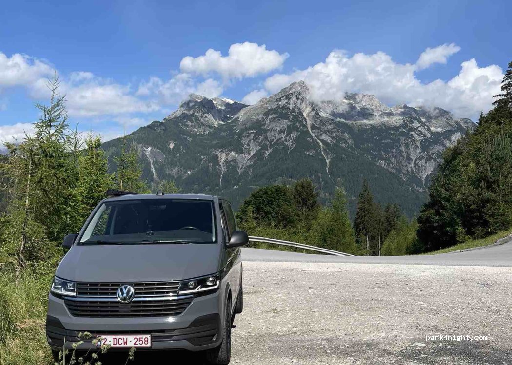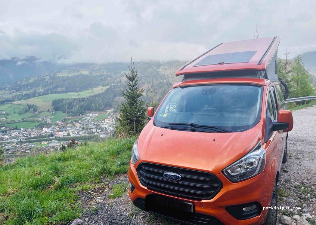 Pěkné místo s výhledem na hrad Hohenwerfen a okolní hory. Parkování s obytňákem je možné jen od 16:00 do 9:00 (tj. jen přes noc; dole před výjezdem nahoru do serpentin je cedule). Trochu je slyšet dálnice. Ráno tak od sedmi už jezdí lidi nahoru na jeskyně. Přes noc nejelo asi žádné auto. Jsou tu dvě místa na parkování.