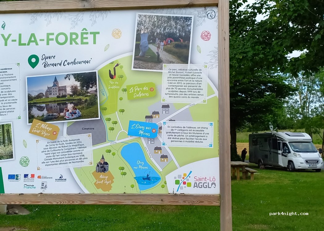 Dans un environnement très agréable : "Abpaye du 12ème, lac très bien entretenu, jardin avec des sculptures d'artistes du monde entier..." toilettes propres, eau et le calme. Did'fficile de faire mieux ! Un grand merci à la ville Cerisy la forêt!