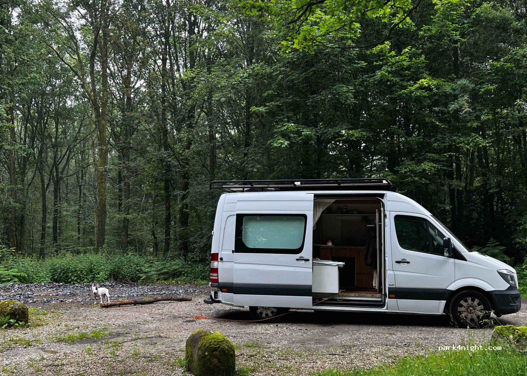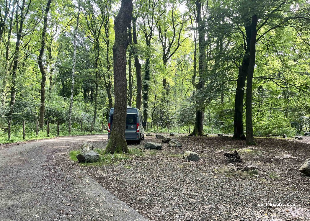 Kleine parking tussen de bomen. Vlakbij de weg, maar toch heel rustig. Geen voorzieningen, zelfs geen vuilbak.