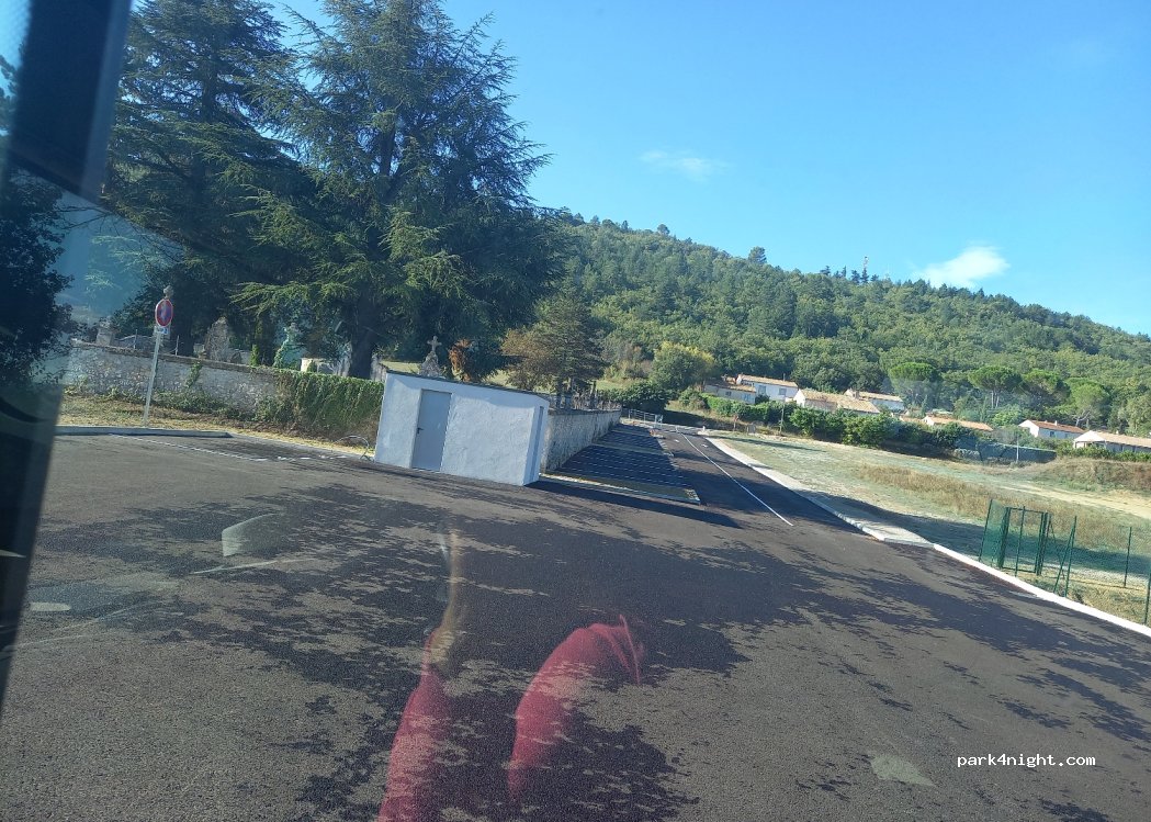 Parking du cimetière entièrement rénové, quasiment plat. En sortie de Village, entouré de végétation. Une nuit très calme, Parfait pour un arrêt sur la route du Verdon.
