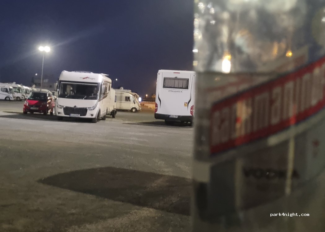 Very large space for parking for all sizes of motor homes and campers. Opposite a shopping mall DOS Mares which seems to be open 7 days a week until 22:00. Plenty of different eating opportunities within a 5-10 minute walk.Would have been 5 stars if there were rubbish bin’s accessible.