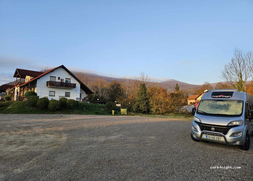 Nous avons passé 1 nuit sur ce parking après avoir mangé au resto. Repas très bon et serveurs agréables! Un peu de bruit provenant de la route mais ça n’empêche pas de dormir. Très bon spot a 10min en voitures de l’entrée 1 du parc Plitvice