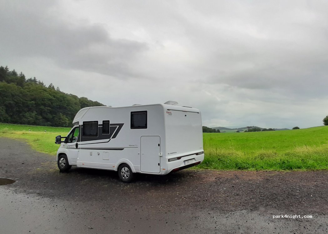 Schöner Tagesparkplatz (geschottert und relativ eben) mit Blick auf die Kasselburg. Dort befindet sich ein Adler-und Wolfspark. geteerter Wanderweg: ca 1 km zu einer Römischen Tempelruine. ca 2 km zu den 'Gerolsteiner Dolomiten' mit Ausblick über Gerolstein und Kylltal.