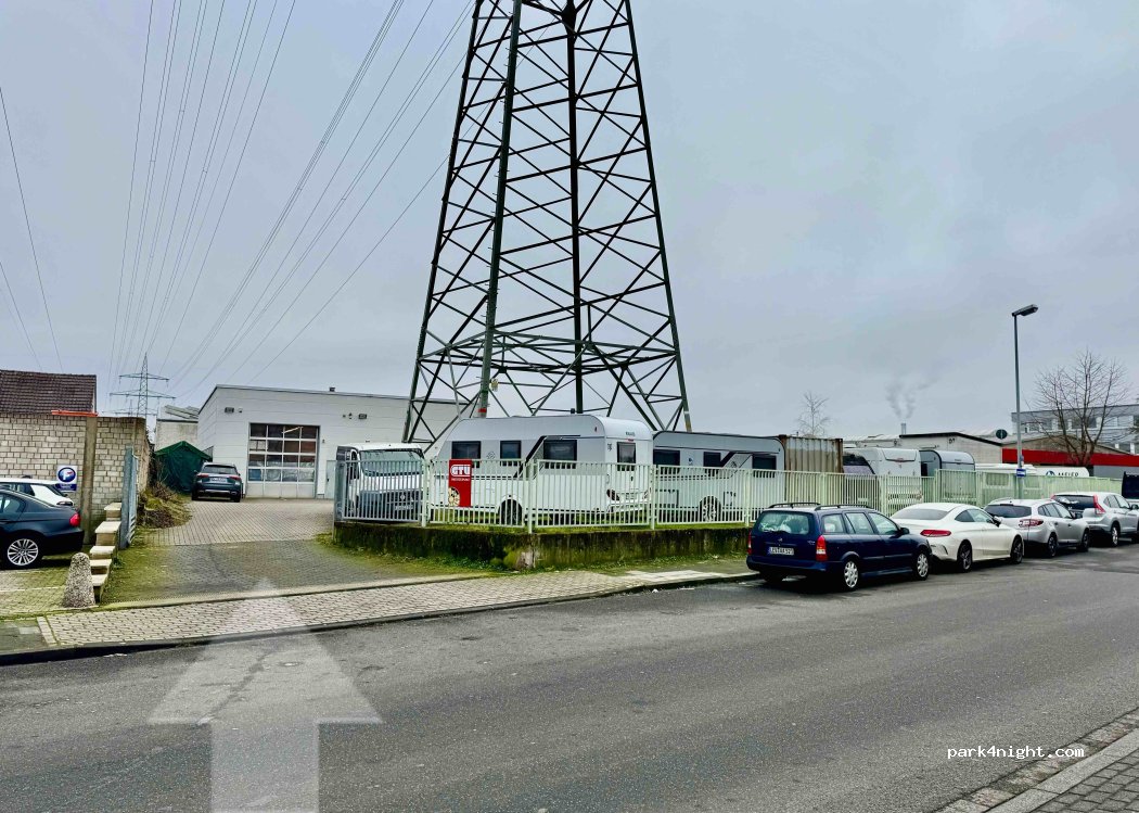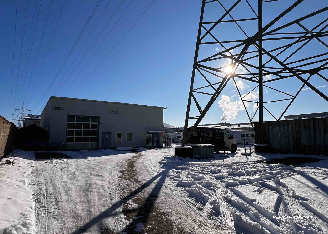 La struttura Camping Meyer si trova sul lato sinistro della strada a senso unico. C'è anche un palo elettrico lì. Puoi semplicemente girarci sopra per fare il pieno di acqua nera, wc chimico e acqua dolce