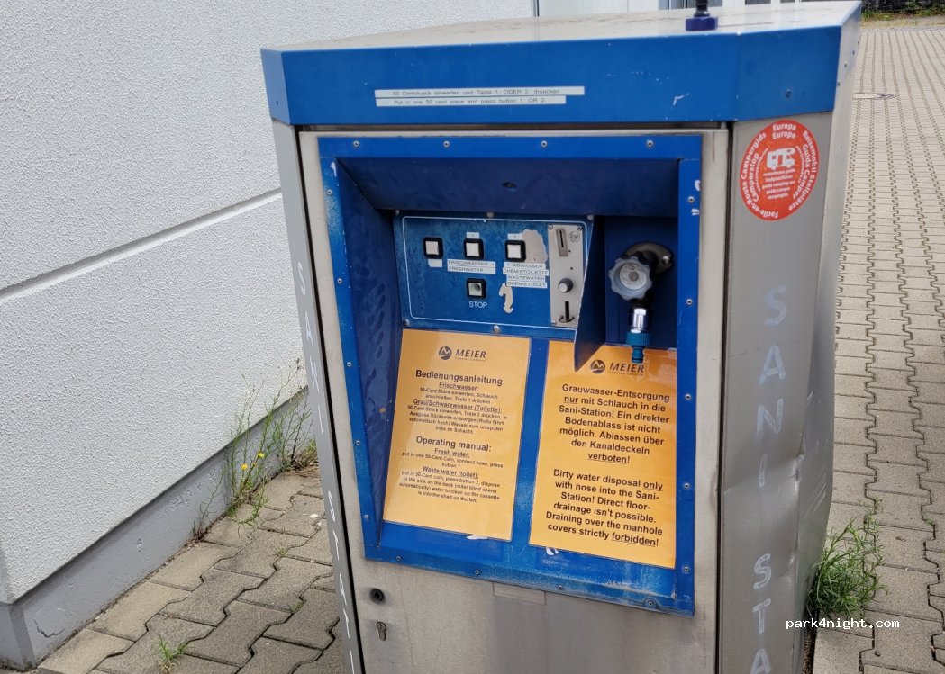 Super pour 0,50€ vous pouvez vider vos eaux grises et noires et remplir vos bidons d’eau potable. Gérant très gentil (parle seulement allemand).