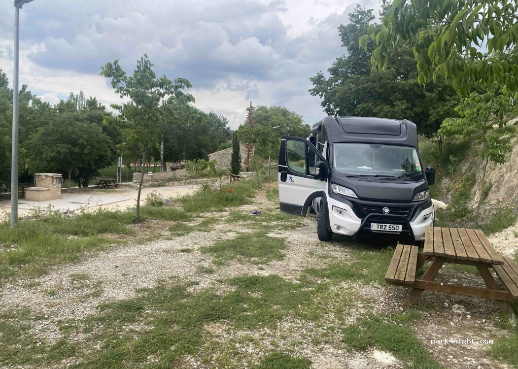 Nous y avons passé la nuit du 26 septembre. Endroit très calme, 3 possibilités pour se garer en restanque, avec une pente d'accessibilité plus importante sur la dernière. Les services y sont et surtout très propre. N'hésitez pas à vous diriger vers le village (bar près de l'église pharmacie etc..), et de monter vers la tour située tout en haut de la col line avec un panorama assez sympathique.