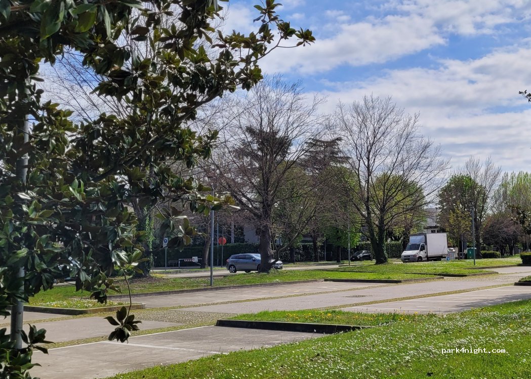 Grand parking calme devant la Villa Bassi, gratuit, excellent de jour comme de nuit, sans bars, très grandes échoppes. Silencieux. Attention le mercredi matin à la présence toute proche du marché hebdomadaire avec pour conséquence un remplissage total du parking.