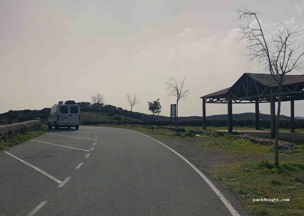 Point de vue "el alto". Endroit calme, à côté d'une route peu fréquentée et avec vue sur la Sierra de Aracena. La rue n'est pas très large et les places de parking sont courtes, il faut donc en occuper un minimum de 2 pour ne pas se faire remarquer. Ce n'est pas non plus un problème car c'est un endroit peu fréquenté et il y a environ 20 places de parking en plus.