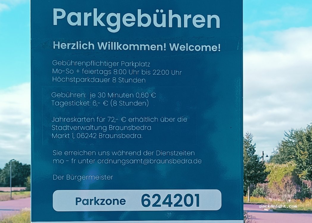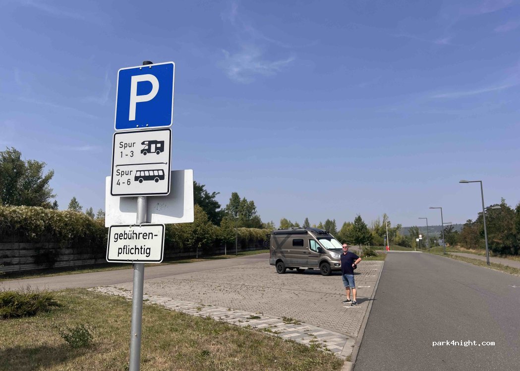 Schöne Aussicht :) Man kann entweder sein Ticket am Automaten ziehen oder über die App. 5€ für 8 Std ist vollkommen in Ordnung. 3 lange Spuren für Wohnmobile (ähnlich Busparkplatz) . Wenn man ordentlich parkt passen Also 6 Wohnmobile hin.