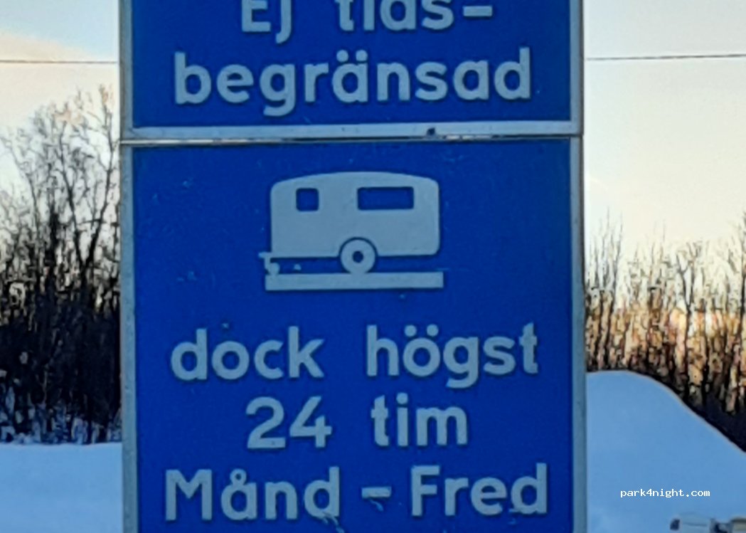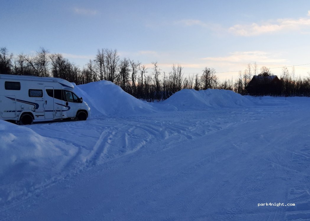Grote, relatief vlakke parkeerplaats (in de winter vrijgemaakt) achter de spoorlijn. Ideaal voor een nacht op doorreis, 24 uur gratis. Direct naast de deur is de huskyboerderij "Husky Dreams" voor sledetochten.