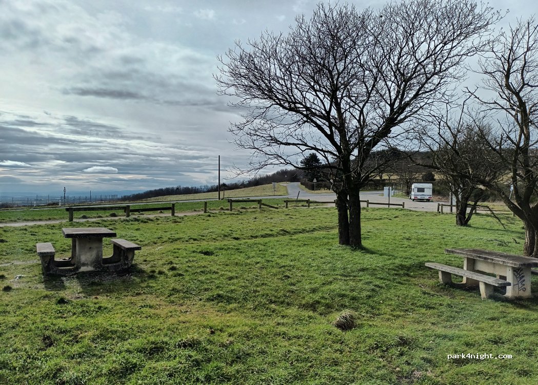 Bel endroit plat avec 5 places réservées camping car. 3 tables et bancs et poubelles juste à côté. Vue exceptionnelle sur les environs. Une belle nuit au calme et en plaine nature avec accès direct sur la route.
