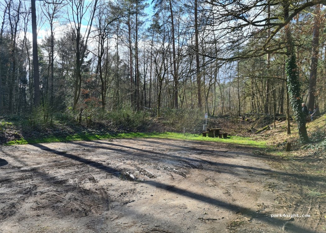 Petit parking forestier avec des sièges, une poubelle et des possibilités de randonnées pédestres et cyclistes. Beaucoup de piétons pendant la journée mais pas de bruit de la rue. Silence total la nuit.