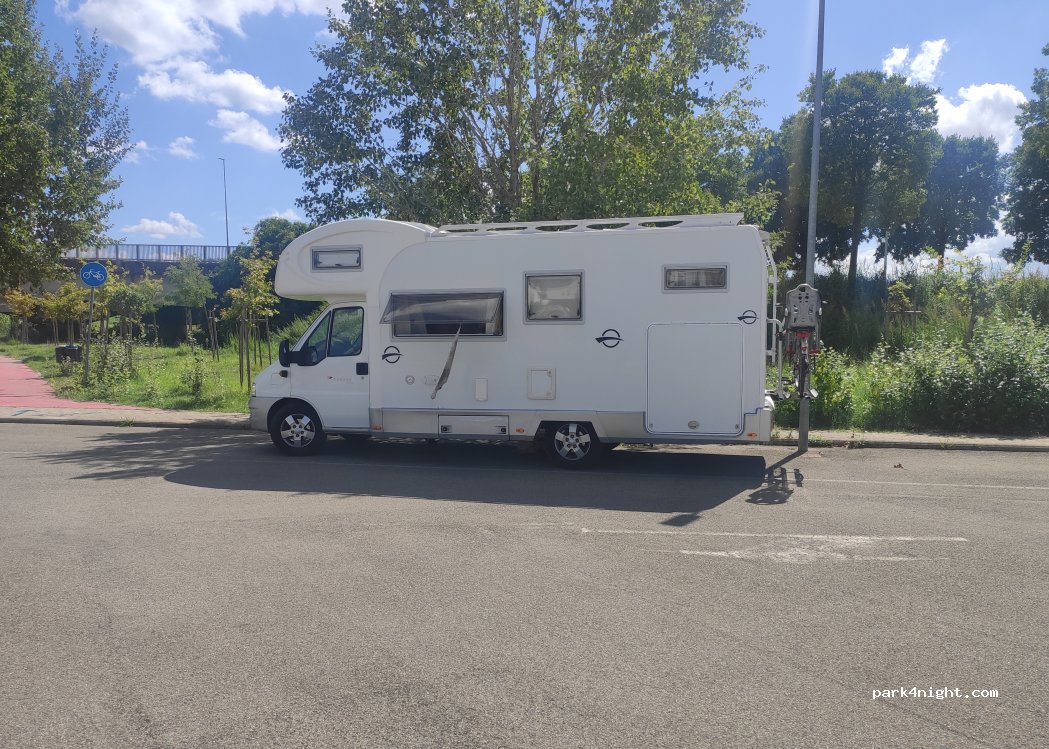 Grand parking près de l'autoroute. Certains mobil-homes sont là pour l'hiver. Dans quartier résidentiel.