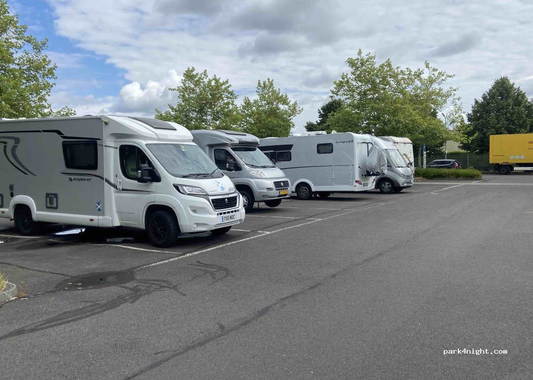 Mooie ruime parkeerplaats met ruimte voor campers. Alle winkels bij de hand. Wij hebben hier één nacht gestaan met nog een camper. S’avonds en s’nachts rustig vanaf 5 uur begint het (vracht) verkeer.