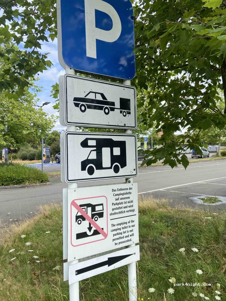 Arrivati alle 21, una sbarra chiude l'ingresso al parcheggio. Se sei dentro resti chiuso lì fino al mattino, altrimenti non puoi entrare. Proseguendo oltre c'è un grosso parcheggio (Lidl e Aldi) illuminato e tranquillo.