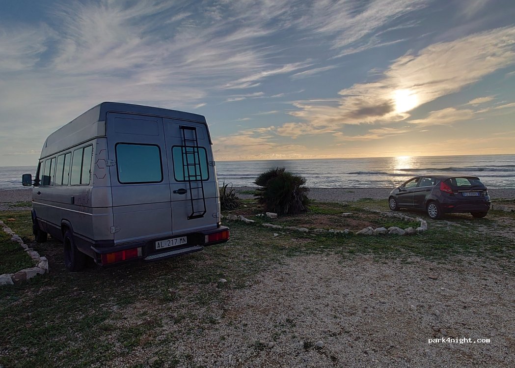 très bel endroit au bord de l eau gratuit ce qui est rare en sicile mais il est vrai très convoité il a fallu que l on s incruste au milieu des auvents mais nous avons passé une très bonne nuit avec le bercement des vagues