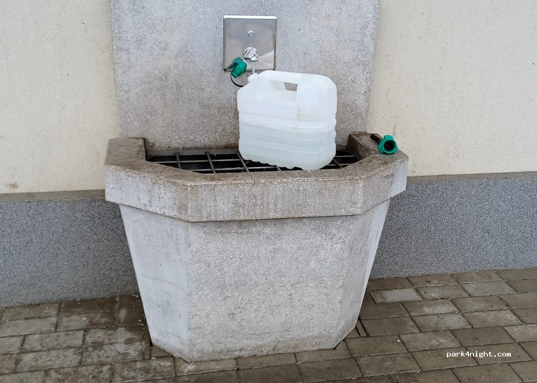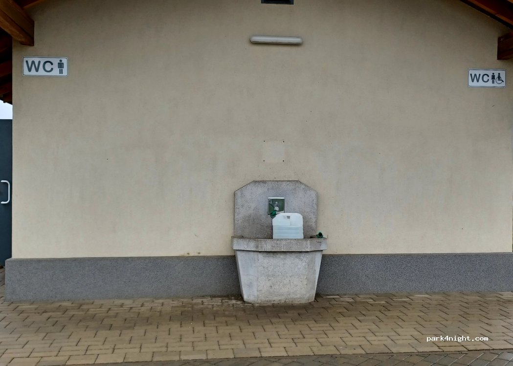 Motorway parking where you can take water with a container, all year round. Water in winter is not easy to find because cut off almost everywhere. There are also toilets, bins, picnic tables, and some green space if you have a dog.