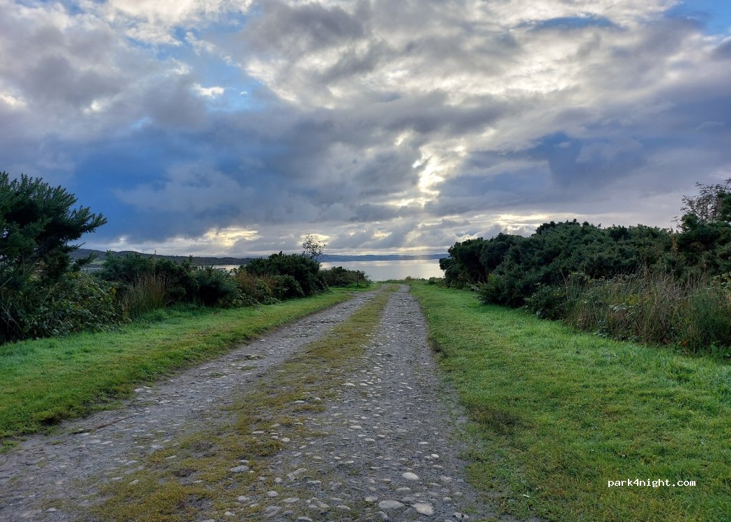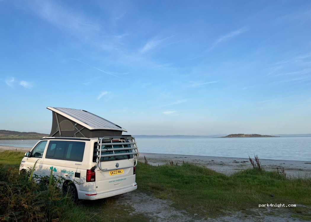 Parking area has space for 4 campervans. However, if you take the turn-around road there is space next to the beach for two vans. We parked next to the beach. There is a picnic bench and various seats overlooking the beach. Lots of midges when we’re there overnight.