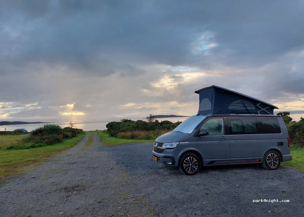 Superbe endroit avec vue sur la plage. Nous avons eu de la chance d'avoir du soleil et peu de vent en fin de journée. Nous avons passés la nuit ici et nous nous sommes sentis en sécurité. Beaucoup de midges cependant. Bien se garer sur le sol en gravier et pas au bord de la plage sur les dunes. Il y a de la place pour plusieurs véhicules. Nous recommandons.
