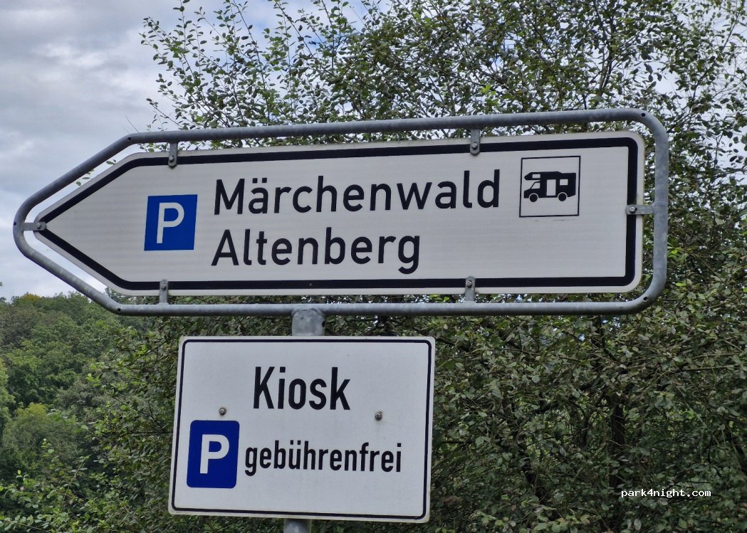 Parking Märchenwald-Altenberg - fee will be charged when visiting the park. Register at the park ticket office and from 20-08h gate is closed from the parking lot (call if necessary). On the large and partly shaded parking lot on the banks of the Dhünn and below the private park 6 plots are also marked for larger campers. Outside the opening hours you stand here quiet until lonely. The fairytale forest is open from March-October daily from 10-18h and November-February daily from 10-16h.
