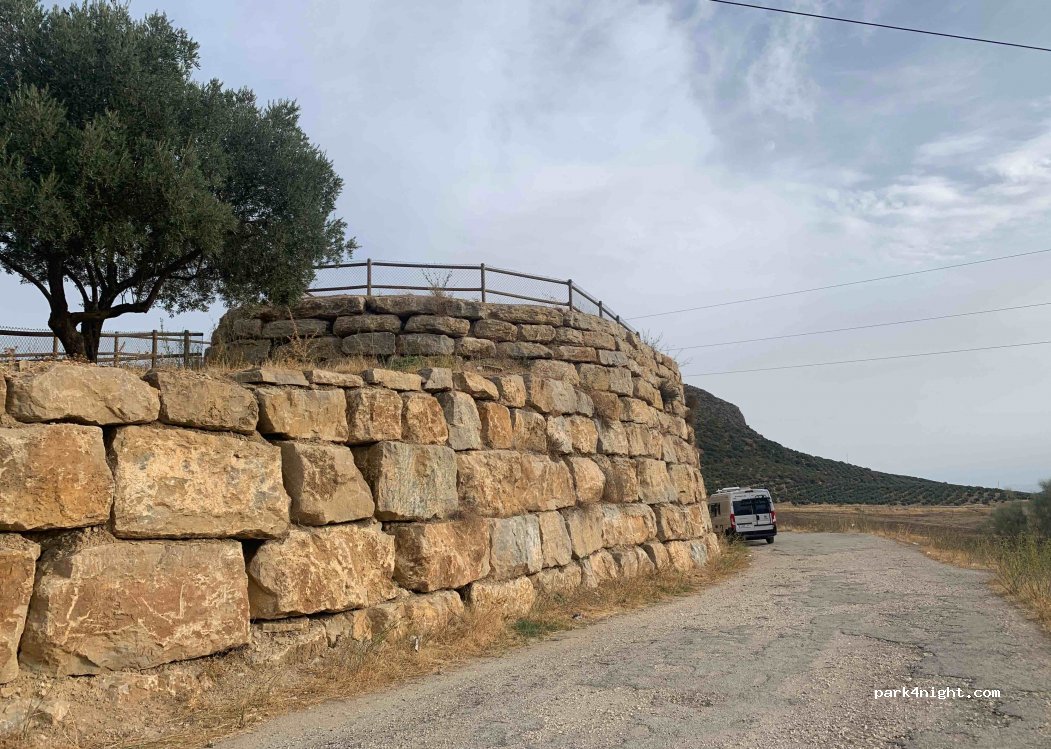Rastplatz parallel zur Straße, in seiner alten Anordnung, mit einem ziemlich flachen Bereich und geschützt durch einen Hügel. Gute Sicht auf die Stadt. Gut zu schlafen mit kaum Lärm von Autos. Sehr ruhiger Ort.