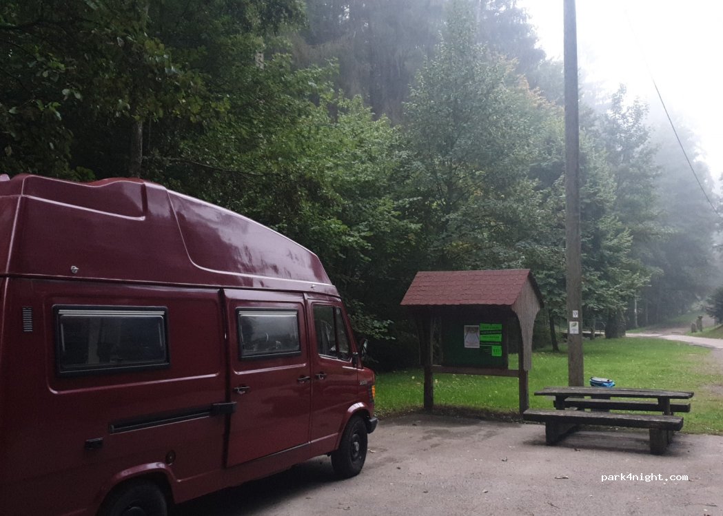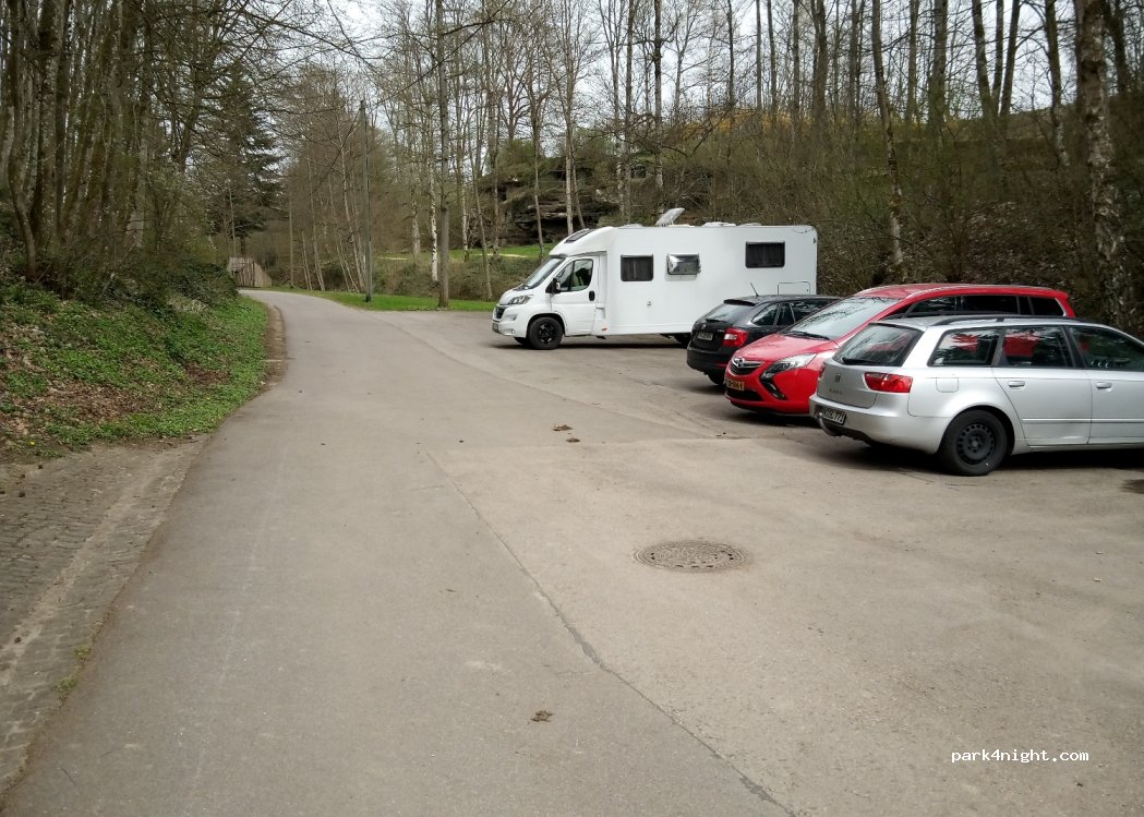 Parking public (à Felsenweiher). Asphalté avec une légère pente latérale. Une petite poubelle est sur place. Situé à l'extérieur d'Ernzen. La voie publique se termine au parking. Donc pas de trafic de transit. Très tranquille.