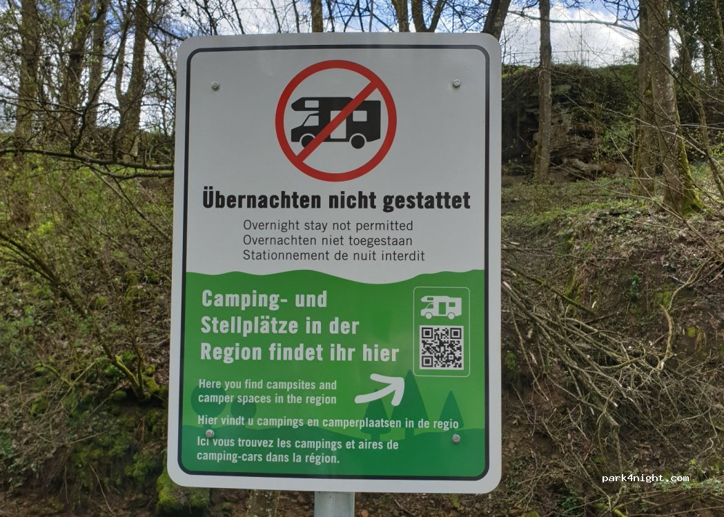 Public car park (at Felsenweiher). Asphalted with a slight side slope. A small garbage can is on site. Located outside of Ernzen. The public road ends at the parking lot. So no through traffic. Very quiet.