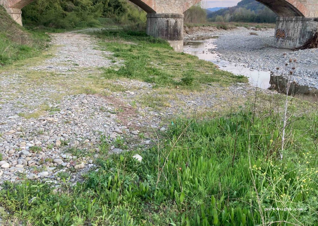 On the edge of the river, a small path easy to access for a small van or van. Avoid for a motorhome. Right next to a busy road but little noise at night. If you park under the bridge nobody can see you from the road.