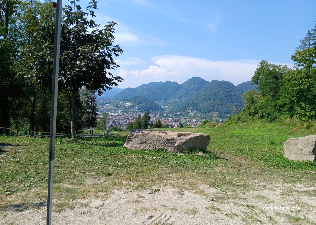 Great location for a few days. Parking lot on a viewpoint above the town. Slightly inclined. The bottom two spaces are almost flat. Access from Pergine on market Saturday may be difficult. Close to a bike park. No prohibition sign.