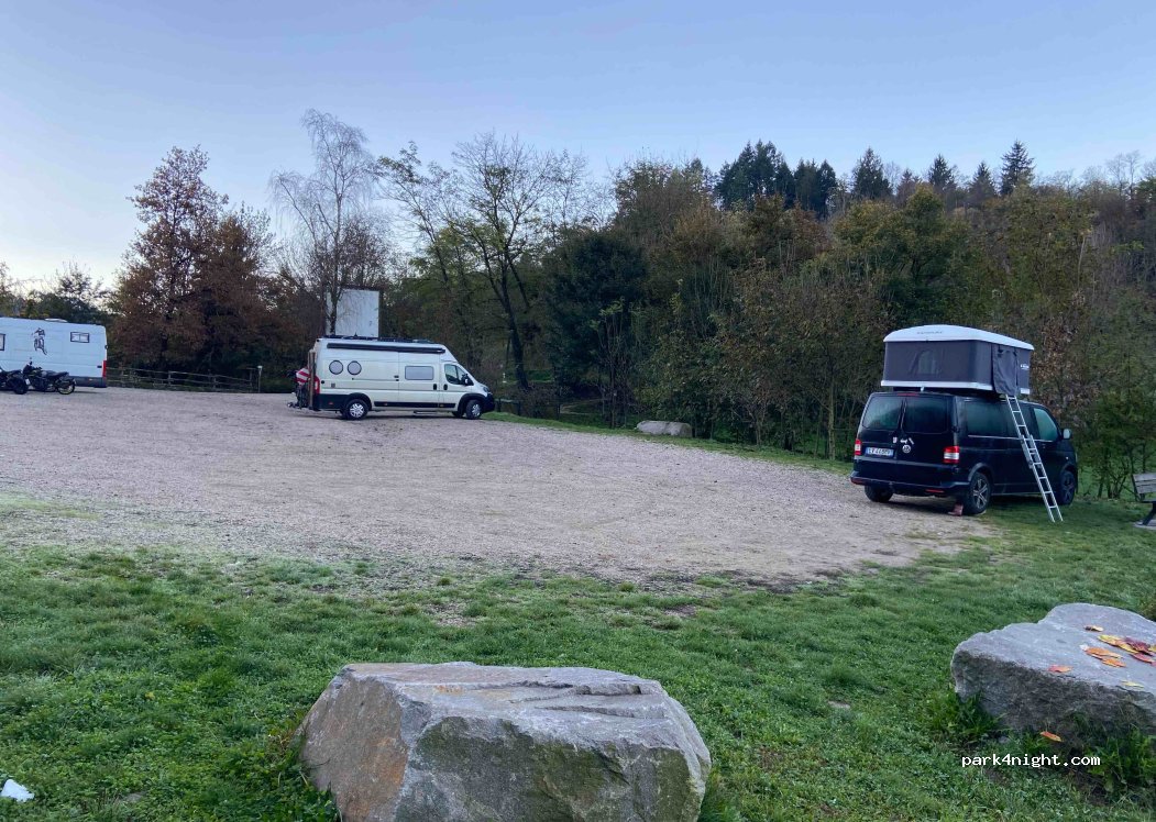 Bellissimo posto molto spazioso con ottima vista sul paese. Il paese si raggiunge a piedi tramite una strada tutta in discesa. Durante il giorno occupato da diverse auto per vedere il castello ma il posto lo trovi comunque. Abbiamo passato una notte molto tranquilla. Accesso facile con un 7 m. Super consigliato!!!