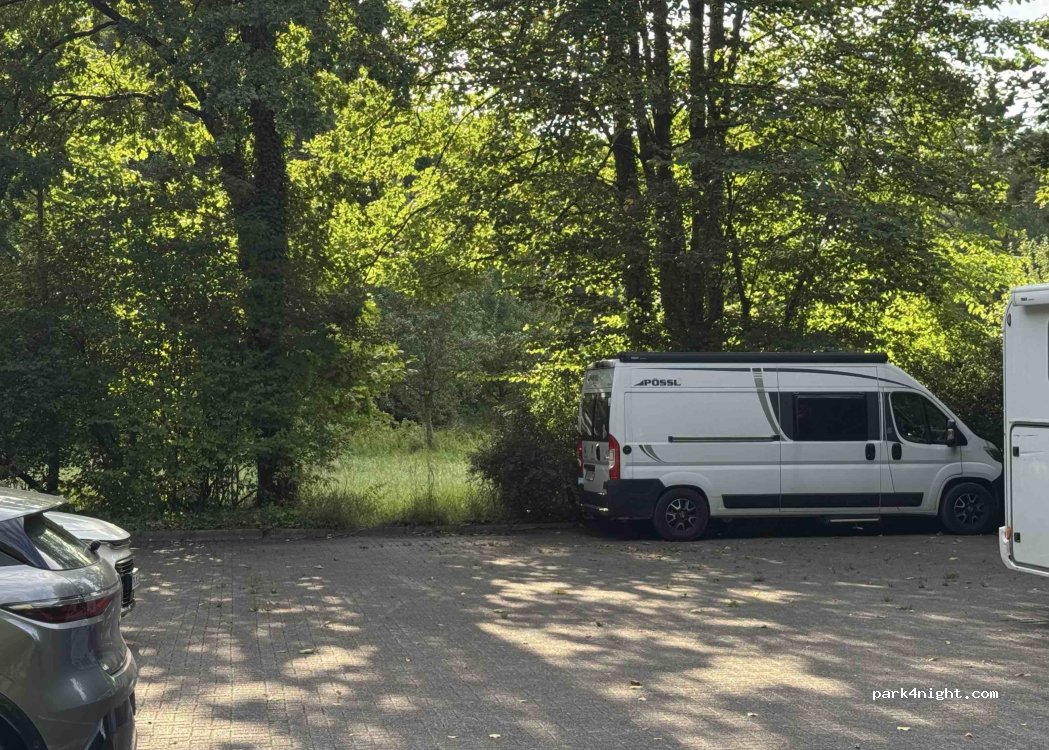 Stationnement en périphérie. Sans signalisation. Les voitures se garent rarement ici. Légèrement oblique. Pas d'installations mais très calme. Environ 15 minutes de marche à travers la forêt jusqu'au centre-ville. Idéal pour les randonnées et les balades à vélo.
