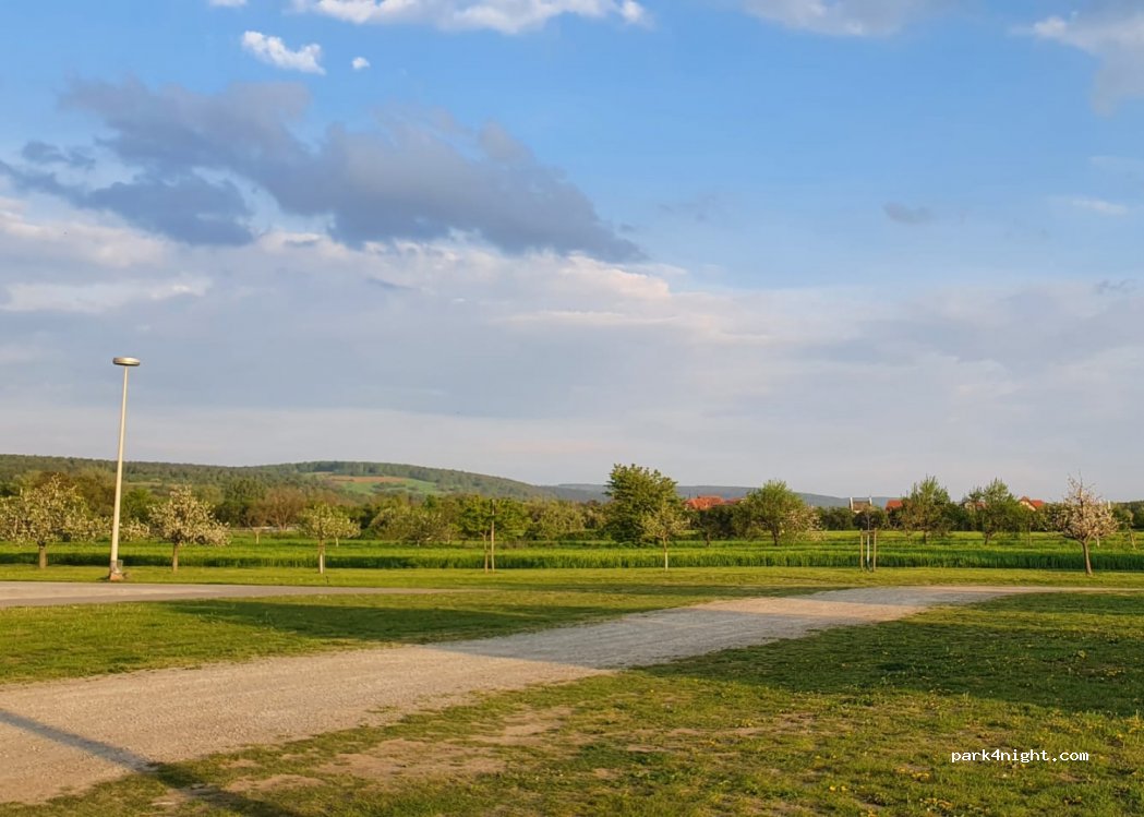 Stationnement dans une salle polyvalente. Pas de panneau d'interdiction pour Wohnmobile ! Honisch Beach (lac de baignade) accessible à pied. Idéal comme point de départ pour des randonnées ou des balades à vélo. Minigolf et Main également accessibles à pied. Gastronomie et commerces en ville.