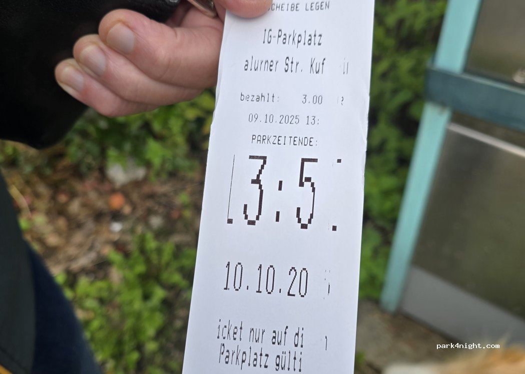 Alles wie beschrieben, außer dass der Automat für die Ticketausgabe funktioniert: 3€/24 Stunden. Nur Zahlung mit Münzen möglich Es steht zwar, dass es eine schriftliche Genehmigung braucht, aber ich bin der Meinung, dass ich die Genehmigung zum parken mit dem Ticket erhalte. Ich habe mit meinem VW California mit aufgestelltem Dach übernacht und alles war ok.