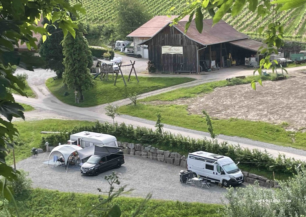 Beautiful quiet spot at a winery. Water from a spring near the parking spot but need a watering can to collect it and be a more patient than a conventional tap. Stunning views. Great hiking and cycling from the pitch. A short walk up hill to an honesty bar at the nearby house where you can buy alcohol and snacks. We cycled to Appenweiner to catch train to Strasburg well worth visit. Thank you